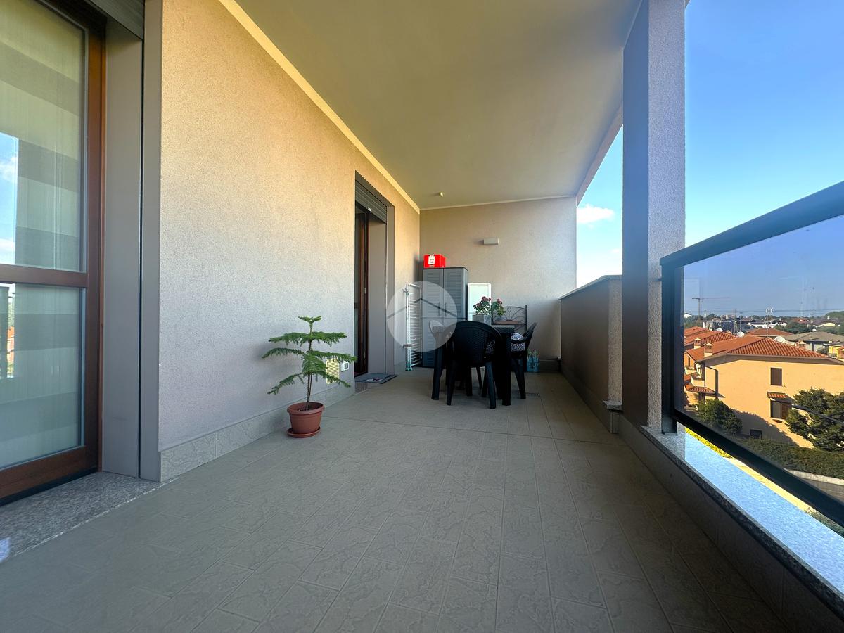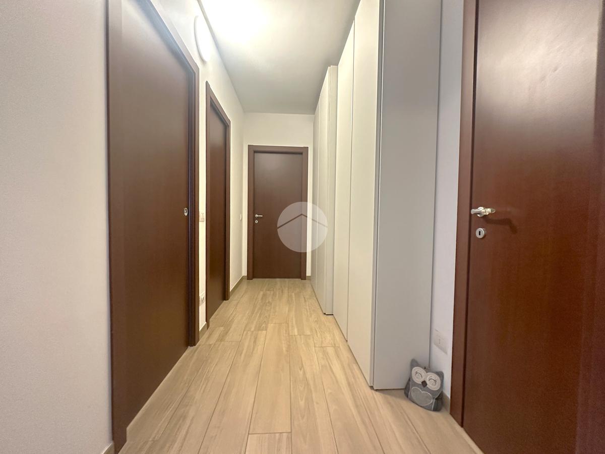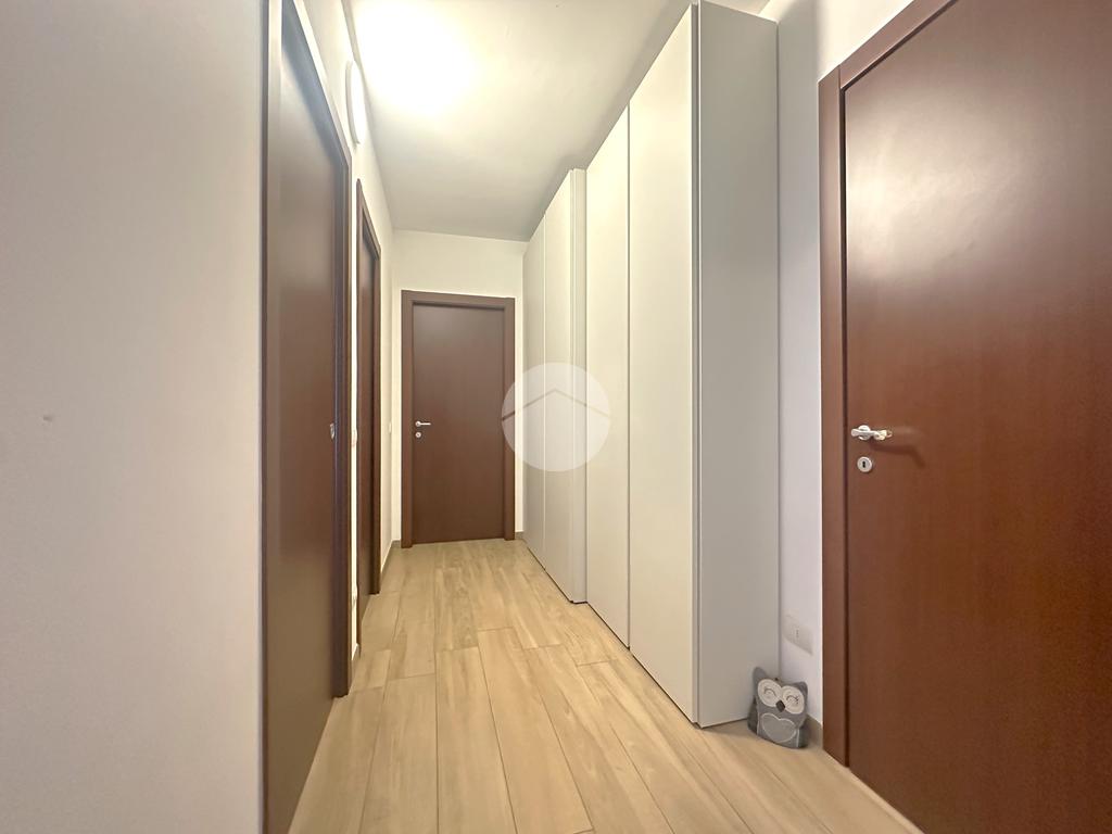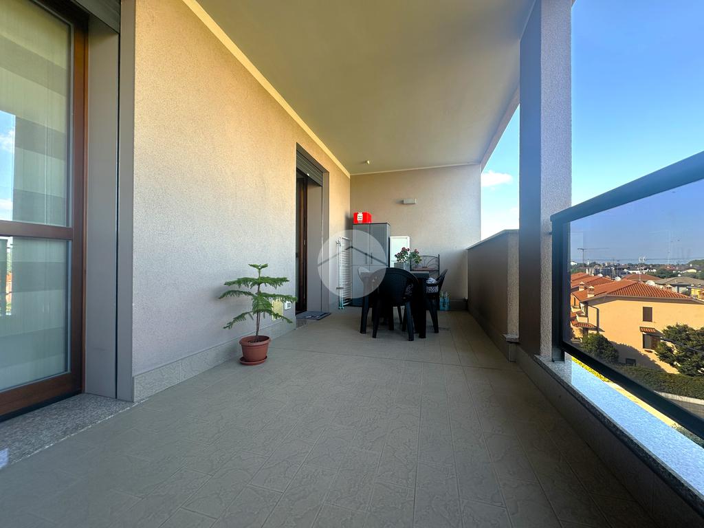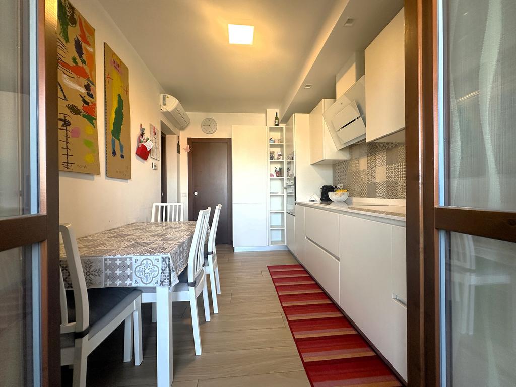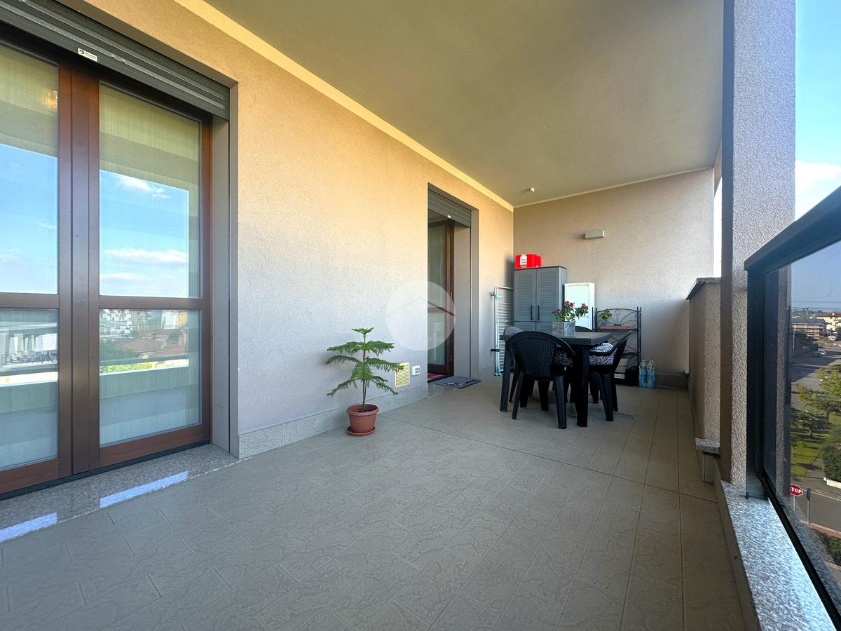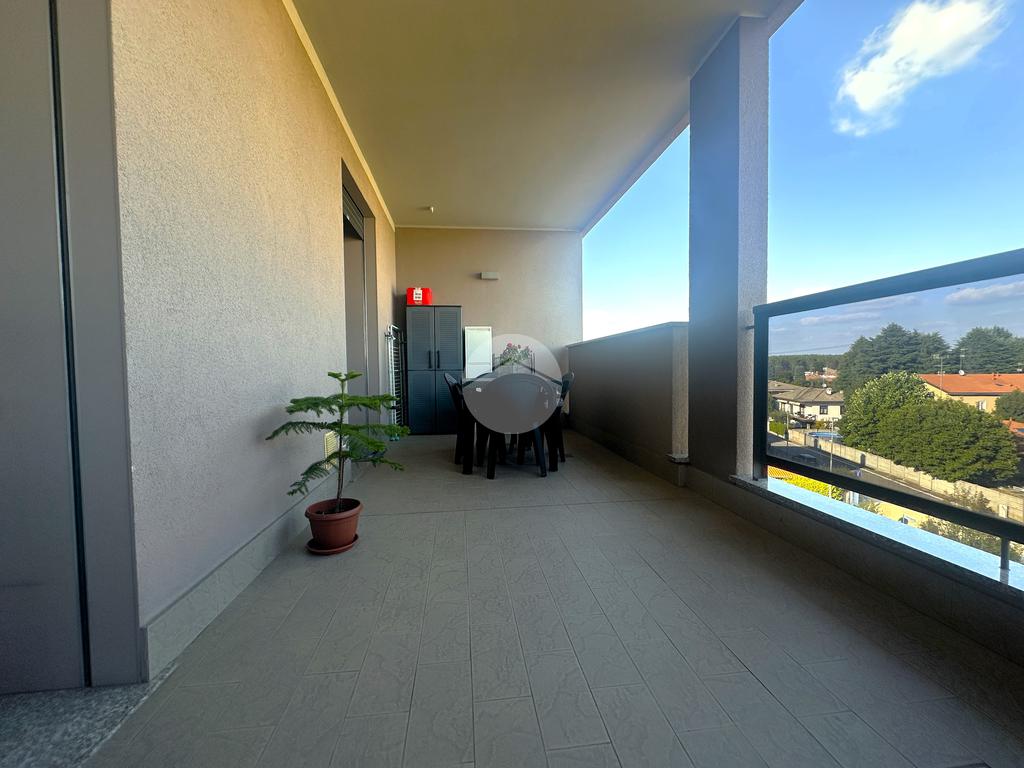 Corbetta: in prestigioso complesso di recentissima realizzazione, completamente privo di barriere architettoniche. In posizione strategica per poter raggiungere, anche a piedi, sia la fermata dell'autobus Magenta-Milano Molino Dorino che la Stazione Ferroviaria. Appartamento in Classe Energetica 'A4' con conseguente presenza di impiantistica e finiture di ultima generazione. Ubicato all'ultimo piano con luminosa e soleggiata doppia esposizione sud-est. Tramite il portoncino blindato d'ingresso, dotato di serratura modello europeo, si accede direttamente nella zona living; qui ci troviamo di fronte un soggiorno estremamente spazioso e godibile; dalla porta finestra ad anta scorrevole, si accede al primo terrazzo della casa. La cucina risulta facilmente abitabile ed ospita un arredo completo di tutti gli elettrodomestici e con diversi piani lavoro; la porta finestra consente l'accesso al secondo terrazzo della casa, il più grande ed il più facilmente arredabile da poter sfruttare per pranzi e cene all'aperto. Adiacente alla cucina è stato ricreato uno spazioso quanto utile locale lavanderia, pratico e funzionale. Il disimpegno, anch'esso sfruttato con arredi capienti e su misura, ci conduce al reparto notte; qui troviamo 2 camere da letto, una matrimoniale ed 1 cameretta, quest'ultima con uscita sul pratico terrazzo condiviso con la cucina. I 2 bagni presenti sono eccezionalmente entrambi finestrati e completi di piatti doccia e relativi box con tutti i sanitari sospesi. L'appartamento è stato completamente ultimato con finiture extra-capitolato, pavimentato in gres-porcellanato effetto parquet di moderna fattura e con relativi rivestimenti anch'essi di nuova concezione. L'abitazione è inoltre completa d'impianto d'aria condizionata con 3 split interni ed unità esterna oltre alla predisposizione per un impianto d'antifurto ed una cassaforte in dotazione. L'abitazione beneficia di riscaldamento a pavimento, con aggiunta di eleganti termoarredi silver nei bagni, il tutto gestito da caldaia condominiale ibrida con pompa di calore, con la presenza di un termostato ambiente in ogni singolo locale, così da avere una maggiore indipendenza ed autonomia nella gestione. L'edificio condominiale è completo d'impianto fotovoltaico per i consumi delle parti comuni. L'appartamento viene consegnato completo di arredamento, tutto di qualità eccelsa, con la presenza di tutti gli elettrodomestici ad incasso e con mobili di pregiata fattura e di recentissima realizzazione. Completano la soluzione una pratica cantina, un ampio box autorimessa e, per chi volesse, a parte, un secondo box di generose metrature.