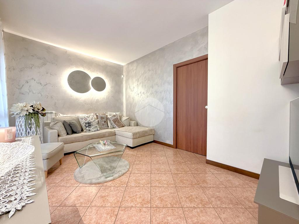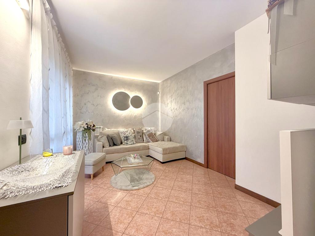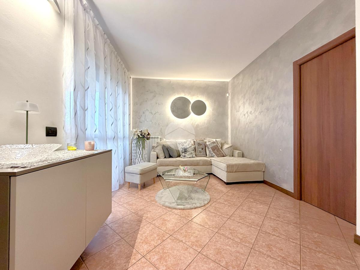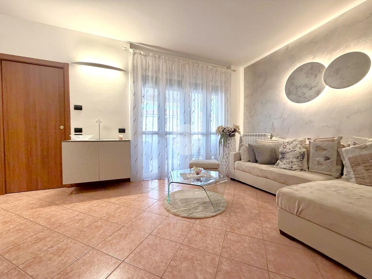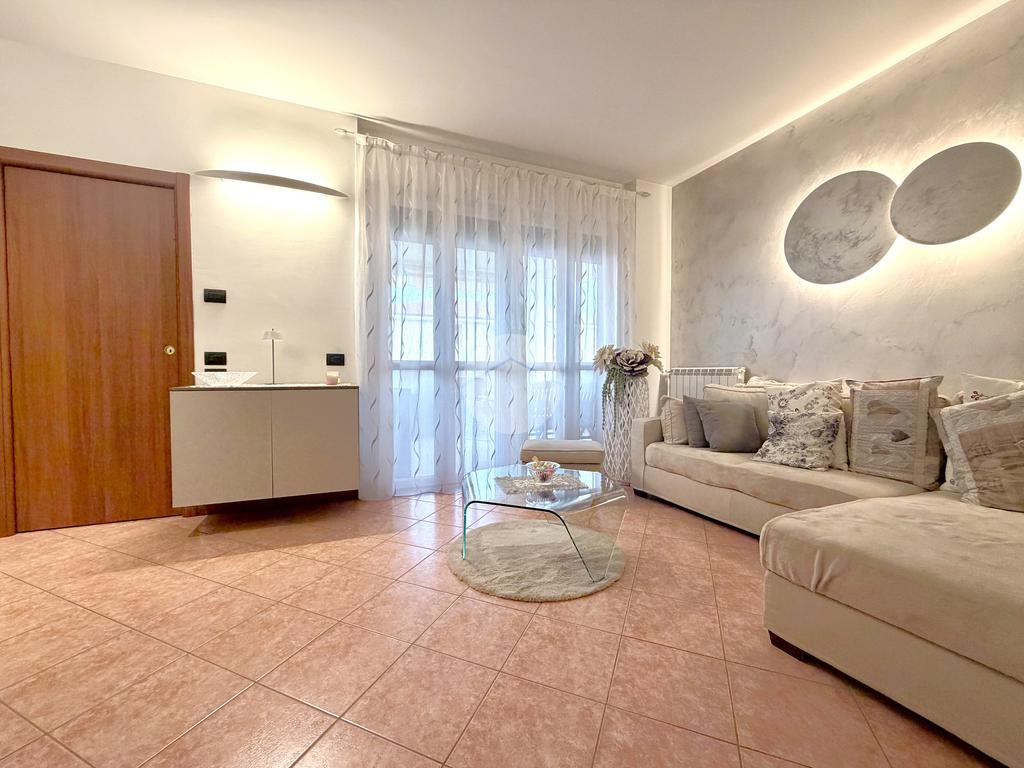 Il soggiorno è accogliente ed estremamente luminoso grazie alla presenza di un’ampia porta-finestra, dalla quale si accede a un terrazzo coperto, regolare e di generose dimensioni, sfruttabile anche in presenza di numerosi ospiti e caratterizzato da una soleggiata esposizione sud-est.